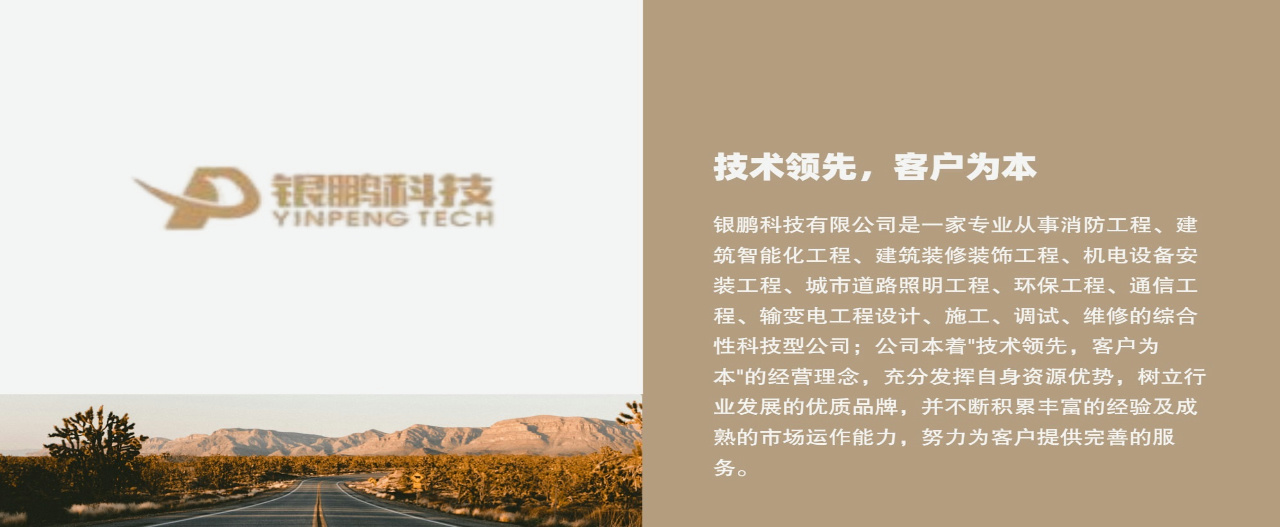 銀鵬科技有限公司是一家專業從事消防工程、建筑智能化工程、建筑裝修裝飾工程、機電設備安裝工程、城市道路照明工程、環保工程、通信工程、輸變電工程設計、施工、調試、維修的綜合性科技型公司。公司具有建設主管部門頒發的《建筑業企業資質證書》:建筑裝修裝飾工程專業承包壹級、消防設施工程專業承包壹級、電子與智能化工程專業承包壹級、防水防腐保溫工程專業承包壹級、建筑機電安裝工程專業承包壹級資質、通信工程總承包貳級、市政公用工程施工總承包貳級、建筑工程施工總承包貳級、古建筑工程專業承包貳級、機電工程施工總承包貳級、輸變電工程貳級、特種工程(特種防雷)專業承包不分等級、智能...